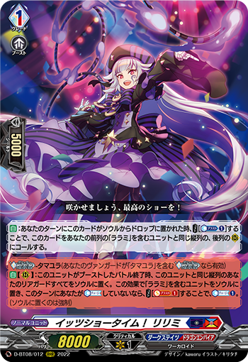 自動【V】:這個單位攻擊先導者時,(費用)[靈魂1枚『於幽遠之夜中 玉響』封鎖]支付的話,你的靈魂含有『莉莉米』與『菈菈米』的卡各最多1枚呼叫至R區,那個回合中,那些單位的力量+5000。那個回合終了時,這個費用封鎖的卡橫置提升。